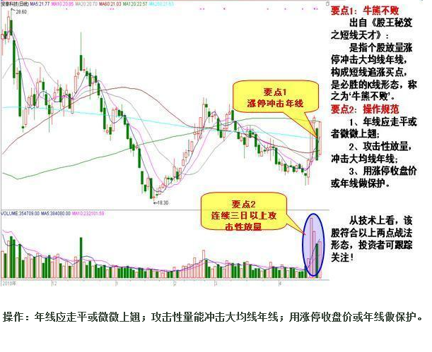 是指個股放量漲停沖擊大均線年,構成短線追漲買點,是必勝的K線形態,稱之為牛熊不敗。