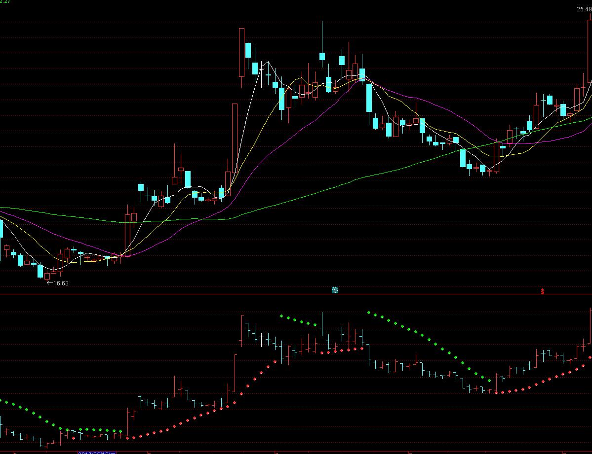 當股票股價從SAR曲線下方開始向上突破SAR曲線時,為買入信號,預示著股價一輪上升行情可能展開,投資者應迅速及時地買進股票。當股票股價向上突破SAR曲線后繼續向上運動而SAR曲線也同時向上運動時,表明股價的上漲趨勢已經形成,SAR曲線對股價構成強勁的支撐,投資者應堅決持股待漲或逢低加碼買進股票。當股票股價從SAR曲線上方開始向下突破SAR曲線時,為賣出信號,預示著股價一輪下跌行情可能展開,投資者應迅速及時地賣出股票。當股票股價向下突破SAR曲線后繼續向下運動而SAR曲線也同時向下運動,表明股價的下跌趨勢已經形成,SAR曲線對股價構成巨大的壓力,投資者應堅決持幣觀望或逢高減磅。