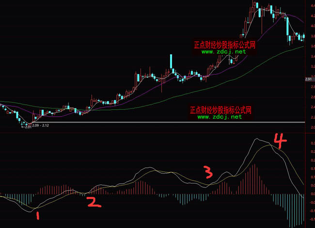圖中的①②③④處都是對應的買賣點,這是MACD金叉死叉買賣點的典型教材案例,MACD最簡單的用法:高位死叉賣出,低位金叉買入。如果同時配合飛刀的10日均線理論使用效果更佳.