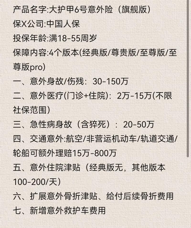 - 中國(guó)人保大護(hù)甲6號(hào)意外險(xiǎn)(旗艦版)是一款綜合性的意外傷害保險(xiǎn)產(chǎn)品,它為18至55歲的人群提供保障,覆蓋1-3類(lèi)職業(yè)。該產(chǎn)品以其全面的保障內(nèi)容、靈活的投保方案以及高性?xún)r(jià)比受到了市場(chǎng)的認(rèn)可......