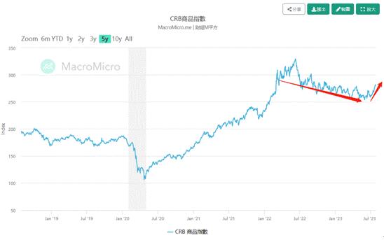 這次的美元加息周期是極為特殊的周期,是下行周期的高通脹,被迫加息,供給不足的問題在高利率的情況下又無法解決,反而由于短期高利率可能消滅了很多存量供給,這就為下次利率轉(zhuǎn)向的通脹埋下伏筆。如果看路透CRB商品指數(shù),整個大宗商品在加息周期也是平穩(wěn)下行,7月底,中國需求刺激預(yù)期疊加美元利率拐點預(yù)期,立刻又拐頭向上。
