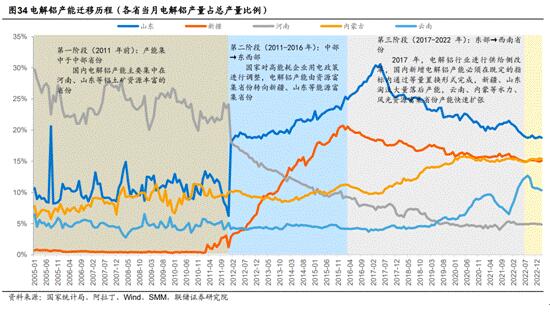 由于電解鋁的特殊的二元性,就導(dǎo)致了電解鋁產(chǎn)業(yè)出現(xiàn)了能源套利的遷徙,產(chǎn)能不斷的從高電力成本的區(qū)域往低電力成本的區(qū)域遷移,中國電解鋁產(chǎn)業(yè)的發(fā)展史就是能源套利的發(fā)展史。基于鋁土礦資源優(yōu)勢起家的河南逐漸沒落,第一波大遷徙是轉(zhuǎn)移到有沿海海運優(yōu)勢和電力成本優(yōu)勢的山東,以及有煤炭資源優(yōu)勢的新疆;第二波大遷徙則是由火電主導(dǎo)的山東、新疆遷移到有綠電資源優(yōu)勢的內(nèi)蒙(風(fēng)光)和云南(水),以云南為終點,中國的電解鋁行業(yè)能源套利之旅可能來到了終點。