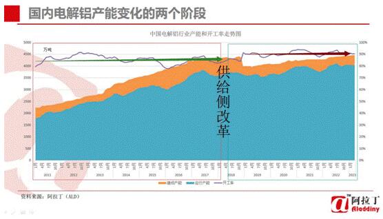 2017年開始我國對電解鋁實施供給側(cè)改革,2018年頒布的《關(guān)于電解鋁企業(yè)通過兼并重組等方式實施產(chǎn)能置換有關(guān)事項的通知》確立了我國電解鋁產(chǎn)能天花板為4500萬噸,以控制行業(yè)產(chǎn)能的無序增長。根據(jù)阿拉丁數(shù)據(jù),2022年我國電解鋁產(chǎn)能已達4418萬噸,全年產(chǎn)量4004萬噸,產(chǎn)能利用率達90.64%,接近飽和狀態(tài)。