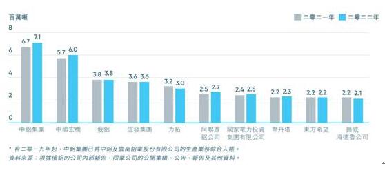 從俄鋁(468.HK)的財報來看,全球前十的廠家中,中鋁鋁業(yè)(601600.SH)并表了云鋁股份(000807.SZ)之后合并名義產(chǎn)能第一,但是實際上權(quán)益產(chǎn)能的第一還是中國宏橋(1378.HK),第一梯隊的兩個龍頭的體量遠遠拋離了第二梯隊。2022年,前十的競爭格局都比較穩(wěn)定,產(chǎn)能上也沒有大的擴張,全球核心公司的供給也趨于穩(wěn)定。