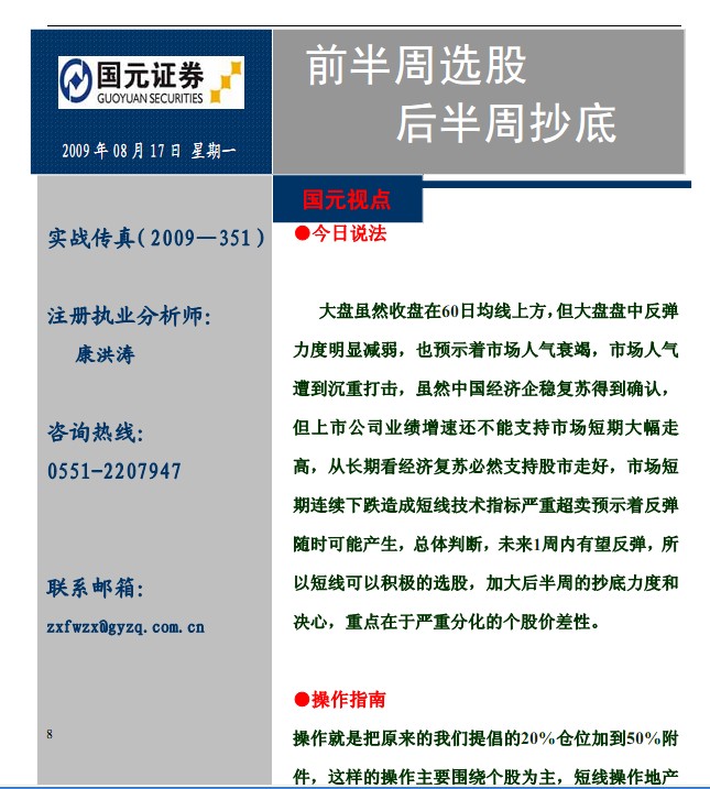 8月17日國元證券實(shí)戰(zhàn)傳真