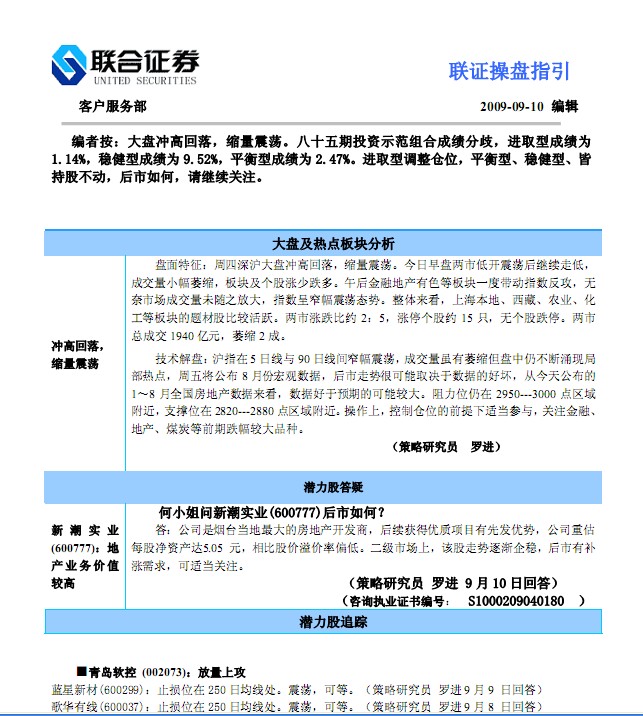 9月10日聯(lián)合證券操盤(pán)指引