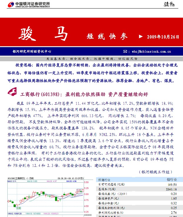 銀河證券駿馬(短線快參):關注基本面,結合技術面,把握中短線,切記控風險;投資思路:國內外經濟復蘇態勢不斷明朗,企業盈利將持續改善,全社會流動性處于合理充裕狀態,市場估值仍有一定上升空間,四季度市場運行中樞還將震蕩上移。投資機會上,投資者可重點選擇強周期性板塊和資產價格泡沫預期下的資源板塊,推薦金融、房地產、有色、煤炭。工商銀行(601398):盈利能力依然強勁 資產質量繼續向好截至 09 年上半年末, 工行總資產 11.44 萬億元,比年初增長 17.2%。貸款余額增長 18.9%;存款增長 15.9%。上半年為提高資金運用效率和收益,公司加大資金運作力度,買入返售金融資產較年初增長 477%。上半年實現凈利潤 666.13 億元, 同比增長 2.7%;每股收益 0.20 元,符合預期。不良貸款保持雙降,全年仍可能繼續雙降。公司全年實現 150%的撥備覆蓋率不會面臨很大的撥備計提壓力。期末撥備覆蓋率 138.2%,較年初提升 8.05 個百分點。NIM 企穩回升勢頭明顯,投行業務對中間業務貢獻不菲。6 月單月 NIM2.25%,環比上升 18 個基點。上半年手續費及傭金凈收入增長 13.3%,增速比 1 季度提高 3.6 個百分點。投行業務收入同比增量占手續費及傭金收入增量的 60.7%。投行業務值得期待。全資子公司工銀國際控股已于 08 年獲得投資銀行業務牌照,有利于工行在香港投行業務的優化。工行在行業低迷期盈利能力下滑幅度慢于同業平均,表現出了較好的抗風險性。不過基于經濟步入復蘇的預期,目前公司 09 年動態 PE 和 PB 分別為 12.4 和 2.3 倍,估值安全性較高,建議投資者關注......