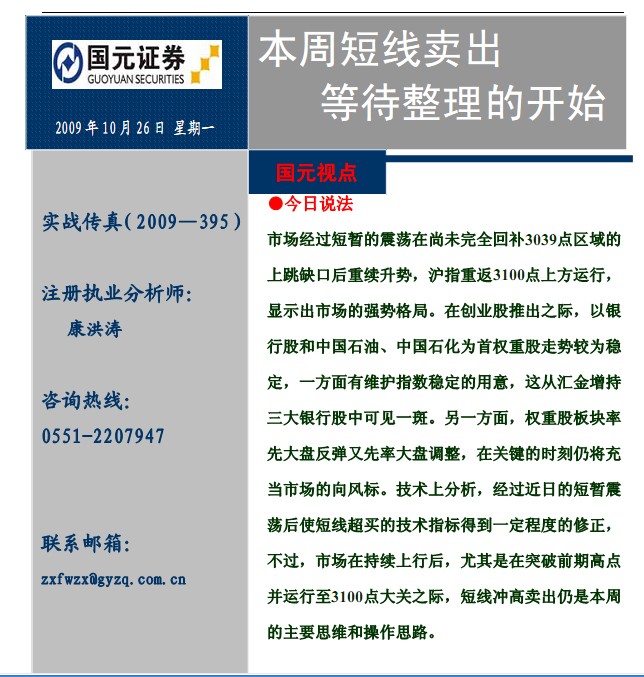 國元證券實戰傳真:市場經過短暫的震蕩在尚未完全回補3039點區域的上跳缺口后重續升勢,滬指重返3100點上方運行,顯示出市場的強勢格局。在創業股推出之際,以銀行股和中國石油、中國石化為首權重股走勢較為穩定,一方面有維護指數穩定的用意,這從匯金增持三大銀行股中可見一斑。另一方面,權重股板塊率先大盤反彈又先率大盤調整,在關鍵的時刻仍將充當市場的向風標。技術上分析,經過近日的短暫震蕩后使短線超買的技術指標得到一定程度的修正,不過,市場在持續上行后,尤其是在突破前期高點并運行至3100點大關之際,短線沖高賣出仍是本周的主要思維和操作思路 ......