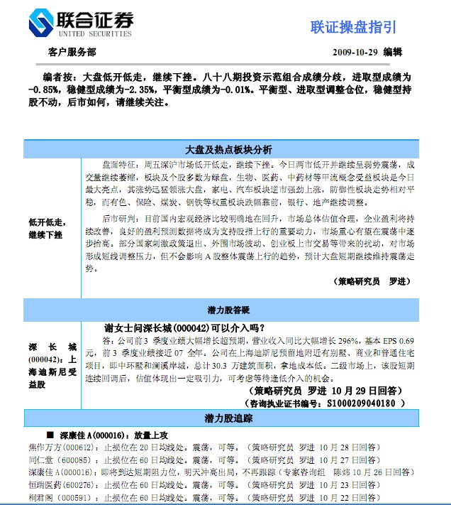 聯合證券操盤指引:盤面特征:周五深滬市場低開低走,繼續下挫。今日兩市低開并繼續呈弱勢震蕩,成交量繼續萎縮,板塊及個股多數為綠盤,生物、醫藥、中藥材等甲流概念受益板塊是今日最大亮點,其漲勢迅猛領漲大盤,家電、汽車板塊逆市強勁上漲,防御性板塊走勢相對平穩,而有色、保險、煤炭、鋼鐵等權重板塊跌幅靠前,銀行、地產繼續調整。后市研判:目前國內宏觀經濟比較明確地在回升,市場總體估值合理,企業盈利將持續改善,良好的盈利預測數據將成為支持股指上行的重要動力,市場重心有望在震蕩中逐步抬高。部分國家刺激政策退出、外圍市場波動、創業板上市交易等帶來的擾動,對市場形成短線調整壓力,但不會影響 A股整體震蕩上行的趨勢,預計大盤短期繼續維持震蕩走勢.......