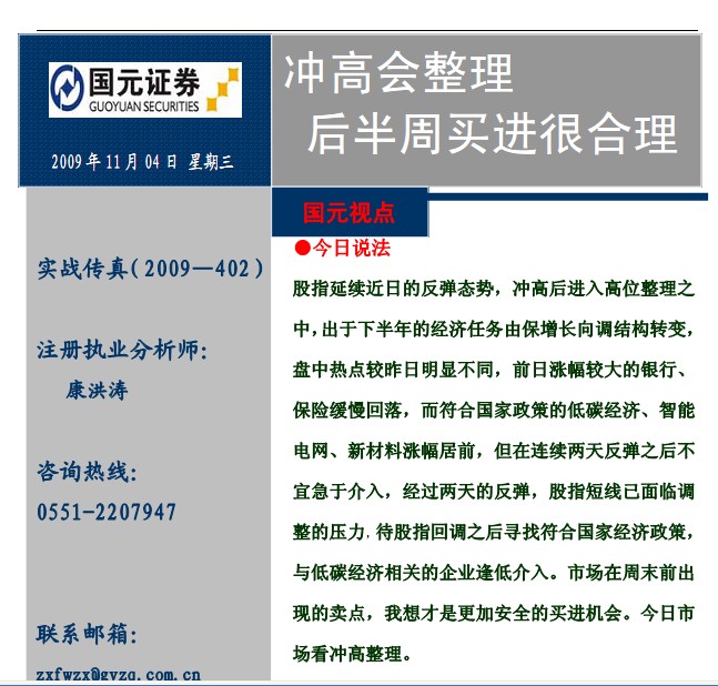 ●今日說法 股指延續近日的反彈態勢,沖高后進入高位整理之中,出于下半年的經濟任務由保增長向調結構轉變,盤中熱點較昨日明顯不同,前日漲幅較大的銀行、保險緩慢回落,而符合國家政策的低碳經濟、智能電網、新材料漲幅居前,但在連續兩天反彈之后不宜急于介入,經過兩天的反彈,股指短線已面臨調整的壓力,待股指回調之后尋找符合國家經濟政策,與低碳經濟相關的企業逢低介入。市場在周末前出現的賣點,我想才是更加安全的買進機會。今日市場看沖高整理......
