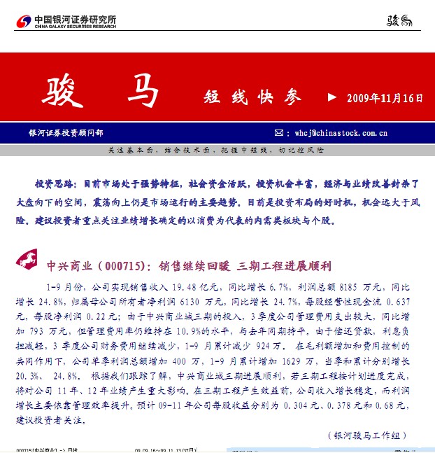 中興商業(yè)(000715):銷售繼續(xù)回暖三期工程進展順利三期工程進展順利 1-9 月份,公司實現(xiàn)銷售收入 19.48 億元,同比增長 6.7%,利潤總額 8185 萬元,同比增長 24.8%,歸屬母公司所有者凈利潤 6130 萬元,同比增長 24.7%,每股經(jīng)營性現(xiàn)金流 0.637 元,每股凈利潤 0.22 元;由于中興商業(yè)城三期的投入,3 季度公司管理費用支出較大,同比增加 793 萬元,但管理費用率仍維持在 10.9%的水平,與去年同期持平。由于償還貸款,利息負擔(dān)減輕,3 季度公司財務(wù)費用繼續(xù)減少,1-9 月累計減少 924 萬。在毛利額增加和費用控制的共同作用下,公司單季利潤總額增加 400 萬,1-9 月累計增加 1629 萬,當季和累計分別增長 20.3%、 24.8%。根據(jù)我們跟蹤了解,中興商業(yè)城三期進展順利,若三期工程按計劃進度完成,將對公司 11 年、12 年業(yè)績產(chǎn)生重大影響。在三期工程產(chǎn)生效益前,公司收入增長穩(wěn)定,而利潤增長主要依靠管理效率提升。預(yù)計 09-11 年公司每股收益分別為 0.304 元、0.378 元和 0.68 元,建議投資者關(guān)注.......