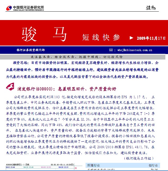浦發(fā)銀行(600000):息差明顯回升、資產(chǎn)質(zhì)量向好公司前三季度共實現(xiàn)利潤 103 億,按定向增發(fā)完成后的股本攤薄后的 EPS 為 1.17 元 。三季度息差上升,中間業(yè)務未現(xiàn)改善、手續(xù)費收入環(huán)比下降,息差在二季度末已基本見底,三季 度公司大幅釋放費用反彈壓力,估計主要是在員工費用方面的剛性反彈公司三季度費用大幅增長,單季度的營業(yè)費用已接近上半年的費用發(fā)生額,費用同比增速從上半年的下降 26% 變成了 1-3 季度的下降 6% 。成本收入比上升近 7 個百分點至 32.3% ,由于中報顯示上半年公司的人均員工工資受到了大幅的壓縮、同比下降 48% ,我們估計這次的費用壓力釋放即主要 來自于員工費用的 回升。 在息差收入快速回升、資產(chǎn)質(zhì)量向好、撥備壓力減輕的背景下大幅釋放費用反彈力,未來直接融資勢在必行。公司資產(chǎn)質(zhì)量的持續(xù)改善降低了撥備計提需求,撥備的小幅回撥和息差收 入的環(huán)比快速增長給三季度費用壓力的釋放提供了一定的空間,但大幅上升的費用支出仍影響了 公司的整體業(yè)績表現(xiàn),使三季度業(yè)績略低于市場預期。公司 2009/2010 攤薄后 EPS1.48/1.78 。在未完成融資前,業(yè)務開展情況將更多取決于監(jiān)管,但估值吸引力在加大,建議投資者關注.......