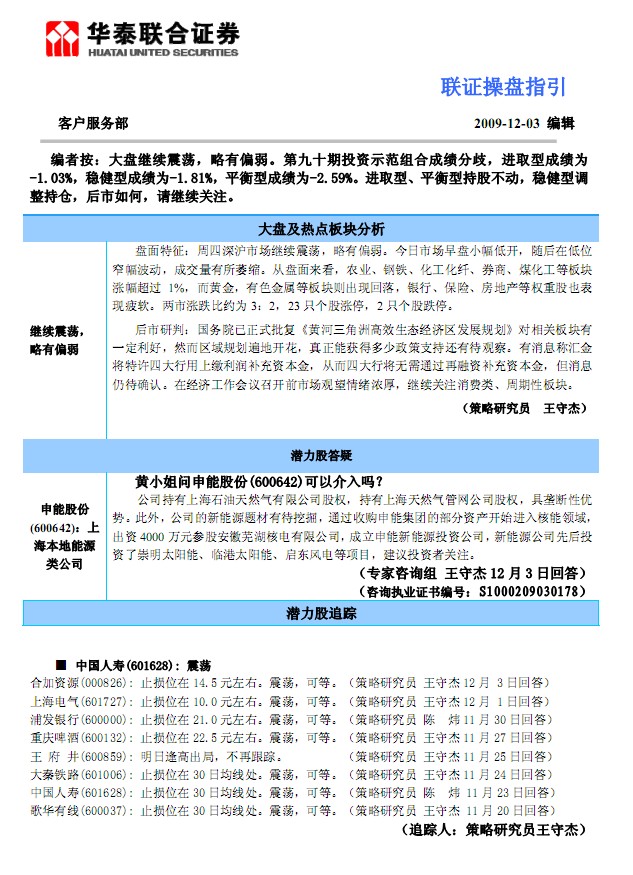 大盤及熱點板塊分析 繼續震蕩, 略有偏弱 盤面特征:周四深滬市場繼續震蕩,略有偏弱。今日市場早盤小幅低開,隨后在低位窄幅波動,成交量有所萎縮。從盤面來看,農業、鋼鐵、化工化纖、券商、煤化工等板塊漲幅超過 1%,而黃金,有色金屬等板塊則出現回落,銀行、保險、房地產等權重股也表現疲軟。兩市漲跌比約為 3:2,23只個股漲停,2 只個股跌停。 后市研判:國務院已正式批復《黃河三角洲高效生態經濟區發展規劃》對相關板塊有一定利好,然而區域規劃遍地開花,真正能獲得多少政策支持還有待觀察。有消息稱匯金將特許四大行用上繳利潤補充資本金,從而四大行將無需通過再融資補充資本金,但消息仍待確認。在經濟工作會議召開前市場觀望情緒濃厚,繼續關注消費類、周期性板塊......