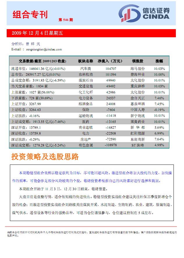 投資策略及選股思路 本期穩健型組合依然以穩定獲利為目標,盡可能回避風險。激進型組合將加大投機的力度,加快操作的頻率,可能會涉足部分風險較高的個股。敬請投資者根據自己的風險喜好進行選擇和甄別。 本期組合開始于11月 3日,12月30日結束,敬請留意。 大盤目前是盤整行情,適合做短線的快進快出。穩健型投資實戰組合建議關注社保三季度新增倉個股的機會;而激進型投資實戰組合則繼續關注煤炭開采、水泥制造、生物制藥、農業、建筑、服裝制造......