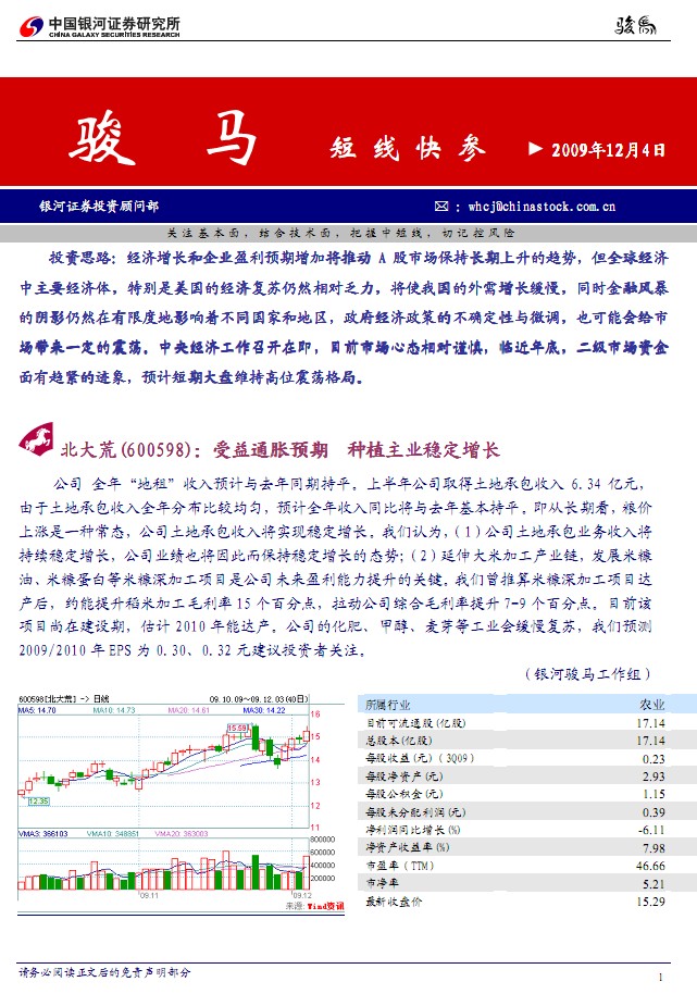 北大荒(600598):受益通脹預(yù)期 公司 全年“地租”收入預(yù)計(jì)與去年同期持平。上半年公司取得土地承包收入 6.34 億元,由于土地承包收入全年分布比較均勻,預(yù)計(jì)全年收入同比將與去年基本持平。即從長期看,糧價(jià)上漲是一種常態(tài),公司土地承包收入將實(shí)現(xiàn)穩(wěn)定增長。我們認(rèn)為,(1)公司土地承包業(yè)務(wù)收入將持續(xù)穩(wěn)定增長,公司業(yè)績也將因此而保持穩(wěn)定增長的態(tài)勢;(2)延伸大米加工產(chǎn)業(yè)鏈,發(fā)展米糠油、米糠蛋白等米糠深加工項(xiàng)目是公司未來盈利能力提升的關(guān)鍵。我們曾推算米糠深加工項(xiàng)目達(dá)產(chǎn)后,約能提升稻米加工毛利率 15 個(gè)百分點(diǎn),拉動(dòng)公司綜合毛利率提升 7-9 個(gè)百分點(diǎn)。目前該.....