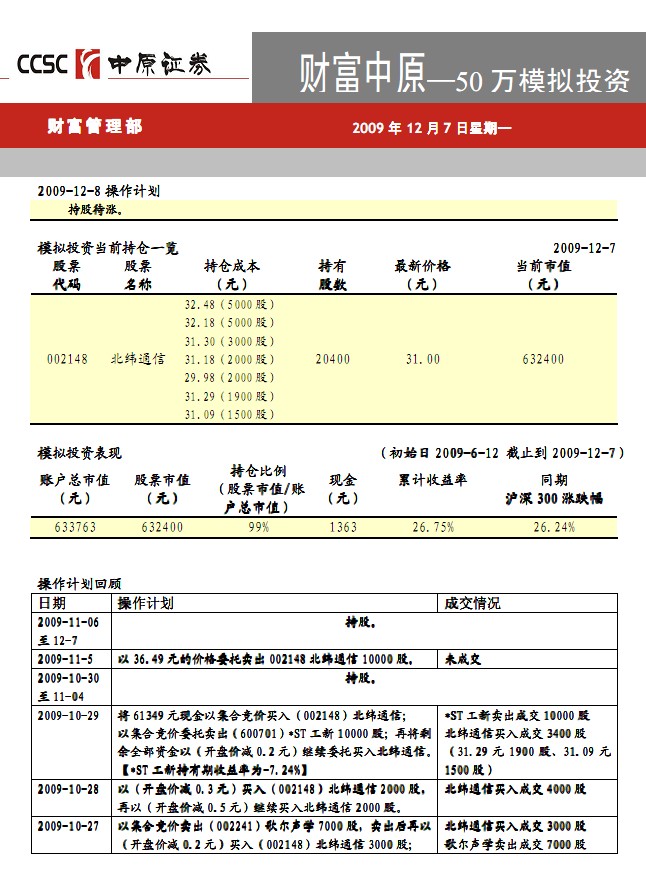 財富中原--50 萬模擬投資說明: 本模擬投資于每日 17:30 前公布次日操作計劃。 嚴格執行提前一日設定委托價格及數量的原則,若委托價格在當日股票交易價格范圍內,即視為以委托價格成交全部委托數量......