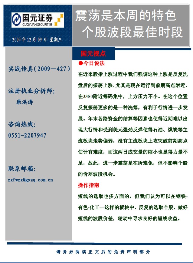 今日說法 在近來股指上漲過程中我們強調這種上漲是反復洗盤后的振蕩上漲, 尤其是現在運行到前期高點附近,在3350附近籌碼集中,上方壓力不小。在這個位置反復振蕩更多的是一種洗籌,有利于行情進一步發展。年末各路資金的結算等因素也使得近期難以出現大行情和受到美元強勁反彈使得石油、煤炭等主流板塊走勢偏弱,沒有主流板塊上攻突破前期高點.....