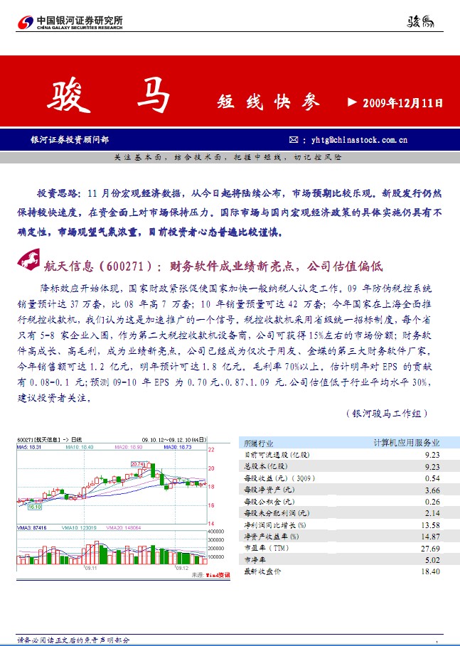 航天信息(600271):財務(wù)軟件成業(yè)績新亮點,公司估值偏低 降標效應(yīng)開始體現(xiàn),國家財政緊張促使國家加快一般納稅人認定工作。09 年防偽稅控系統(tǒng)銷量預(yù)計達 37 萬套,比 08 年高 7 萬套;10 年銷量預(yù)量可達 42 萬套;今年國家在上海全面推行稅控收款機,我們認為這是加速推廣的一個信號。稅控收款機采用省級統(tǒng)一招標制度,每個省只有 5-8 家企業(yè)入圍,作為第二大稅控收款機設(shè)備商,公司可獲得 15%左右的市場份額;財務(wù)軟件高成長、高毛利,成為業(yè)績新亮點。公司已經(jīng)成為僅次于用友、金蝶的第三大財務(wù)軟件廠家。今年銷售額可達 1.2 億元,明年預(yù)計可達 1.8 億元。毛利率 70%以上。估計明年對 EPS 的貢獻有 0.08-0.1 元;預(yù)測 09-10 年 EPS 為 0.70 元、0.87、1.09 元.公司估值低于行業(yè)平均水平 30%.......