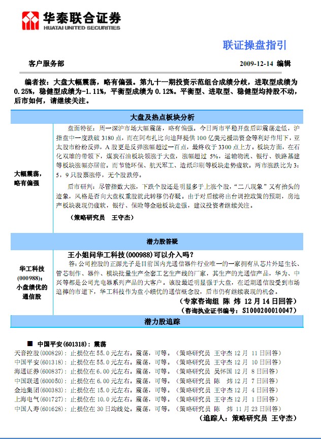 大盤及熱點板塊分析 大幅震蕩, 略有偏強 盤面特征:周一深滬市場大幅震蕩,略有偏強。今日兩市平穩開盤后即震蕩走低,滬指盤中一度跌破 3180 點,而在阿布扎比向迪拜提供 100 億美元援助資金等利好作用下,亞太股市紛紛反彈,A股更是反彈漲幅超過一百點,最終收于 3300 點上方。板塊方面,在石化雙雄的帶領下,煤炭石油板塊領漲于大盤,漲幅超過 5%,運輸物流、銀行、鐵路基建等板塊漲幅亦居前。而節能環保、航天軍工、造紙印刷等板塊走勢疲軟。兩市漲跌比為 3: 5,9 只股票漲停,無個股跌停。 后市研判:盡管指數大漲,下跌個股還是明顯多于上漲個股, “二八現象”又有抬頭的跡象,風格是否向大盤權重股就此轉移仍存疑。由于對后續將出臺調控政策的預期,房地產板塊表現仍疲軟,銀行、保險等金融板塊走強,建議投資者繼續關注......