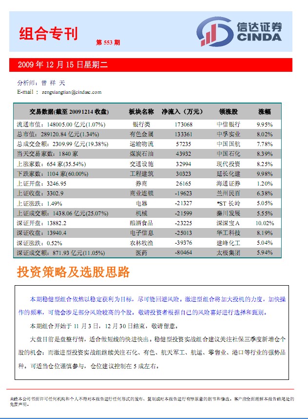 12月15日信達(dá)證券組合專刊