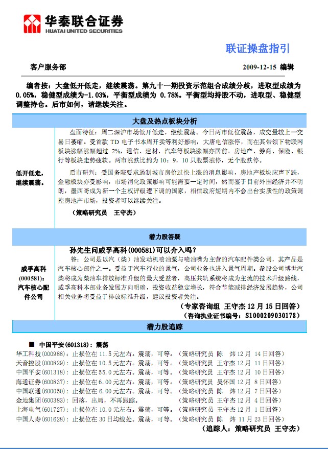 大盤及熱點板塊分析 低開低走, 繼續震蕩。 盤面特征:周二深滬市場低開低走,繼續震蕩。今日兩市低位震蕩,成交量較上一交易日萎縮。受首款 TD 電子書本周開賣等利好影響,大唐電信漲停,而在其帶領下物聯網板塊漲幅漲幅超過 2%,通信、建材、汽車等板塊漲幅亦居前。房地產、券商、保險、銀行等板塊走勢疲軟。兩市漲跌比約為 10:9,10 只股票漲停,無個股跌停。 后市研判:受國務院要求遏制城市房價過快上漲的消息影響,房地產板塊應聲下跌,金融板塊亦受影響,市場消化政策影響可能需要一定時間,然而鑒于目前外圍經濟并不明朗,墨西哥成為新一個主權評級遭下調的國家,相信政府短期內不會出臺實質性的政策調控房地產市場,投資者可以繼續關注......