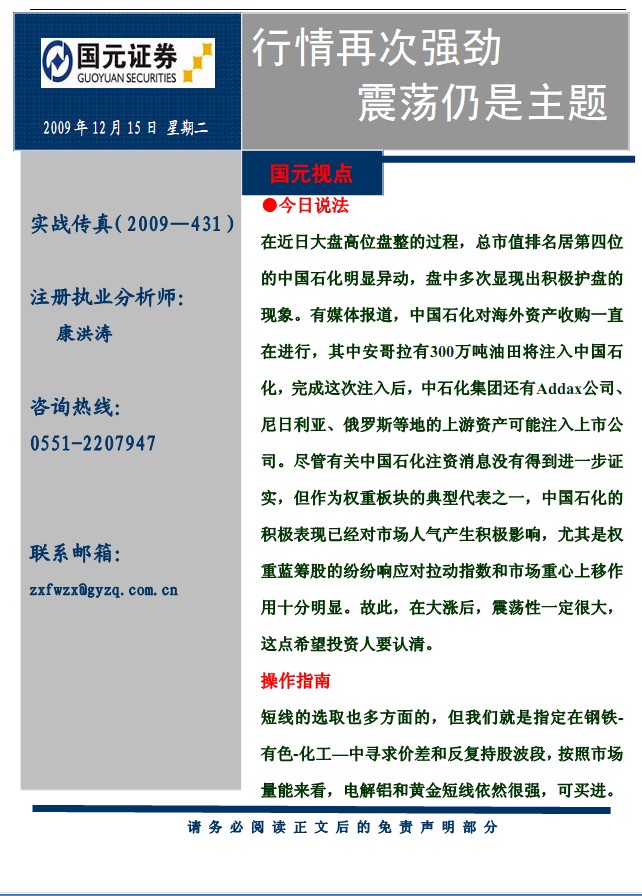 今日說法 在近日大盤高位盤整的過程,總市值排名居第四位的中國石化明顯異動,盤中多次顯現出積極護盤的現象。有媒體報道,中國石化對海外資產收購一直在進行,其中安哥拉有300萬噸油田將注入中國石化,完成這次注入后,中石化集團還有Addax公司、尼日利亞、俄羅斯等地的上游資產可能注入上市公司。盡管有關中國石化注資消息沒有得到進一步證實,但作為權重板塊的典型代表之一,中國石化的積極表現已經對市場人氣產生積極影響,尤其是權重藍籌股的紛紛響應對拉動指數和市場重心上移作用十分明顯。故此,在大漲后,震蕩性一定很大,這點希望投資人要認清。 操作指南 短線的選取也多方面的,但我們就是指定在鋼鐵......