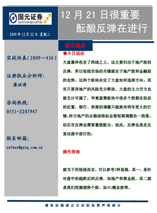 今日說法 大盤最終收在了兩線之上,這主要歸功于地產股的反彈,所以短線市場的關鍵就在于地產股和金融股的走勢,這兩個板塊決定了大盤如何選擇方向。其實只要房地產的風險充分釋放,大盤的主力空方也就無計可施了,畢竟藍籌板塊中很多個股都在低估的位置,銀行、券商的調整只能換來明年更大的行情, 昨日地產的企穩或將標志著短期調整告一段落,但后市反彈也需要量能配合。故此,反彈也是在反復動蕩中前行的......