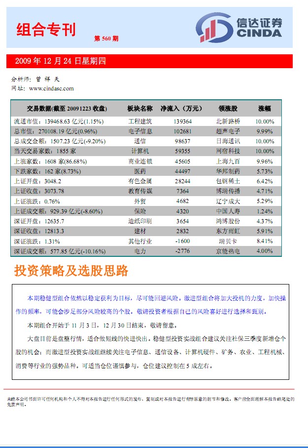 投資策略及選股思路 本期穩(wěn)健型組合依然以穩(wěn)定獲利為目標(biāo),盡可能回避風(fēng)險(xiǎn)。激進(jìn)型組合將加大投機(jī)的力度,加快操作的頻率,可能會(huì)涉足部分風(fēng)險(xiǎn)較高的個(gè)股。敬請(qǐng)投資者根據(jù)自己的風(fēng)險(xiǎn)喜好進(jìn)行選擇和甄別。 本期組合開(kāi)始于11月 3日,12月30日結(jié)束,敬請(qǐng)留意。 大盤(pán)目前是盤(pán)整行情,適合做短線的快進(jìn)快出。穩(wěn)健型投資實(shí)戰(zhàn)組合建議關(guān)注社保三季度新增倉(cāng)個(gè)股的機(jī)會(huì);而激進(jìn)型投資實(shí)戰(zhàn)組繼續(xù)關(guān)注電子信息、通信設(shè)備、計(jì)算機(jī)硬件、礦務(wù)、農(nóng)業(yè)、工程機(jī)械、消費(fèi)等行業(yè)的強(qiáng)勢(shì)品種。可適當(dāng)倉(cāng)位謹(jǐn)慎參與,倉(cāng)位建議控制在 5成左右......