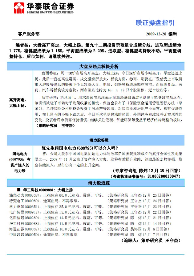 高開(kāi)高走,大幅上揚(yáng)。 盤面特征:周一深滬市場(chǎng)高開(kāi)高走,大幅上揚(yáng)。今日深滬市場(chǎng)小幅高開(kāi),早盤迅速上揚(yáng),此后一直在高位震蕩,成交量有所放大。板塊方面,券商、期貨在廣發(fā)借殼上市取得重大進(jìn)展等消息的提振下全天領(lǐng)漲大盤,電器、鋼鐵等板塊漲幅亦居前。而釀酒食品、醫(yī)藥、汽車等板塊較為疲軟。兩市漲跌比約為 16:1,18 只個(gè)股漲停,無(wú)個(gè)股跌停。 后市研判:消息面上,周末溫家寶總理表示刺激經(jīng)濟(jì)政策過(guò)早退出可能導(dǎo)致前功盡棄,該講話減輕了市場(chǎng)對(duì)于政策收緊的擔(dān)憂。保監(jiān)會(huì)公布了《保險(xiǎn)資金運(yùn)用管理暫行辦法(草案) 》 ,允許保險(xiǎn)公司把資金投資于房地產(chǎn)等領(lǐng)域,對(duì)保險(xiǎn)業(yè)和房地產(chǎn)業(yè)而言,都有促進(jìn)作用。在上周五的小幅下跌之后,今日再次呈現(xiàn)普漲的局面,外圍經(jīng)濟(jì)和政策并無(wú)實(shí)質(zhì)性的變化,投資者后市仍需保持謹(jǐn)慎,繼續(xù)關(guān)注低碳、節(jié)能環(huán)保等受益于經(jīng)濟(jì)結(jié)構(gòu)調(diào)整的板塊.......