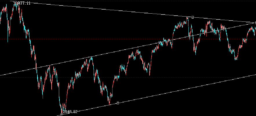從波浪走勢上看:波浪理論講述的是只是趨勢的方向;推動浪是5個子浪組成由,所以下跌行情(浪)也可以以5個浪的形態(tài)展開。D浪(1664———目前)屬于假牛市,呈3浪運(yùn)行。特征如下:1.D浪是一種變形的部分調(diào)整,成交量方面也隨之不斷增加。2.D浪形成多是“V”形反轉(zhuǎn)形態(tài)完成,并連續(xù)以大陽線向上拓展空間,表現(xiàn)出強(qiáng)勁的反彈特征。1664點(diǎn)---2100點(diǎn)為D浪第一小浪,2100點(diǎn)---1814點(diǎn)為D浪第二小浪。1814點(diǎn)以來的上漲屬于D浪的第三小浪。2037點(diǎn)---3453點(diǎn)的上漲是D浪第三小浪的主升浪,形成擴(kuò)散喇叭型,當(dāng)喇叭型向上沖刺時,理論上是一次消耗性上升的開始,顯示市場激動的投資情緒進(jìn)一步擴(kuò)大,投資者已完全失去理性的控制,瘋狂地不計價追入。當(dāng)購買力消耗完結(jié)后,便大幅跌下來。第4浪多以比較復(fù)雜的形態(tài)出現(xiàn),是針對前期第3浪的深幅調(diào)整。市場不會接連地以同樣的方式演變。2402點(diǎn)—2037點(diǎn)是簡單的A—B—C結(jié)構(gòu)的前置三角形調(diào)整,那么4浪就是復(fù)雜形態(tài)的鋸齒浪。鋸齒形的三浪下跌模式,標(biāo)為A-B-C,浪的順序是5-3-5。3454點(diǎn)~~2639點(diǎn)為A浪,結(jié)構(gòu)為5浪。2639點(diǎn)展開的是B浪反彈。2639點(diǎn)---3068點(diǎn)為B浪第一小浪,3068點(diǎn)---2712點(diǎn)為B浪第二小浪,2712點(diǎn)的上漲是B浪第三小浪。從30分鐘的走勢圖分析,受基本面的因素影響,從3361點(diǎn)回落的市場在逐步構(gòu)成雙重三型態(tài)的平臺型調(diào)整。以之字形運(yùn)行