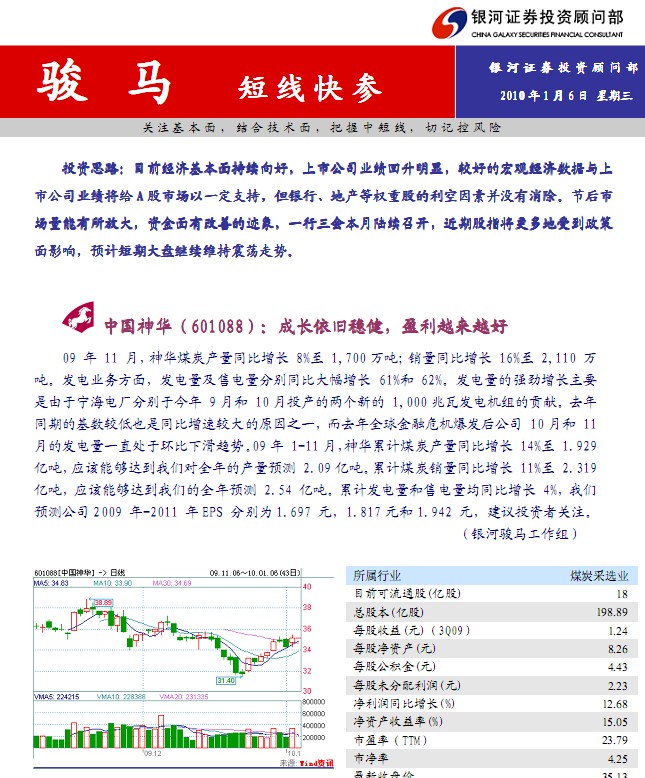 中國(guó)神華( 601088 ):成長(zhǎng)依舊穩(wěn)健,盈利越來(lái)越好 ): 09 年 11 月 , 神華煤炭產(chǎn)量同比增長(zhǎng) 8% 至 1,700 萬(wàn)噸 ; 銷量同比增長(zhǎng) 16% 至 2,110 萬(wàn)噸。發(fā)電業(yè)務(wù)方面,發(fā)電量及售電量分別同比大幅增長(zhǎng) 61% 和 62% 。發(fā)電量的強(qiáng)勁增長(zhǎng)主要是由于寧海電廠分別于今年 9 月和 10 月投產(chǎn)的兩個(gè)新的 1,000 兆瓦發(fā)電機(jī)組的貢獻(xiàn) 。 去年同期的基數(shù)較低也是同比增速較大的原因之一 , 而去年全球金融危機(jī)爆發(fā)后公司 10 月和 1 1 月的發(fā)電量一直處于環(huán)比下滑趨勢(shì) 。 09 年 1-11 月 , 神華累計(jì)煤炭產(chǎn)量同比增長(zhǎng) 14% 至 1.92 9 億噸 , 應(yīng)該能夠達(dá)到我們對(duì)全年的產(chǎn)量預(yù)測(cè) 2.09 億噸 。 累計(jì)煤炭銷量同比增長(zhǎng) 11% 至 2.319 億噸 , 應(yīng)該能夠達(dá)到我們的全年預(yù)測(cè) 2.54 億噸 。 累計(jì)發(fā)電量和售電量均同比增長(zhǎng) 4% , 我們預(yù)測(cè)公司 2009 年 -2011 年 EPS 分別為 1.697 元, 1.817 元和 1.942 元,建議投資者關(guān)注 ......