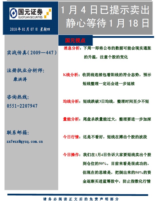 震蕩中的個股也適合短線操作 下周初要公布12月份宏觀經濟數據,由于北方暴雪的原因,12月CPI普遍預期 會出現超預期增長,因此,不少人認為加息會提前到來。對此本欄認為可能 性不大,原因就在于在經濟回升勢頭沒有完全確立,加息很顯然不合時宜。 更何況CPI超預期是偶然因素造成,不是常態。實際上適度的通脹對股市是有 好處的,特別是當CPI超過一年定期存款利率時,反而會促使銀行儲蓄資金的 回流股市。今日熱點出現轉移的現象,高科技板塊出現調整和分化,從資金 的動向看,屬正常的技術調整,后市依然看好。而其他版塊確實也沒能力調 動市場人氣,大藍籌板塊相反還對指數做出了拖累,但我們依然尊重市場對 股指期貨的預期,會對大藍籌板塊構成穩定的支撐,甚至局部走強,包括近期調整幅度不小的地產股,也都出現了回穩的動作。可以注意相關概念股的進一步走強,整理的時間還會延續,但目前是不具備深度的整理過程,可以進一步的挖掘個股的機會......