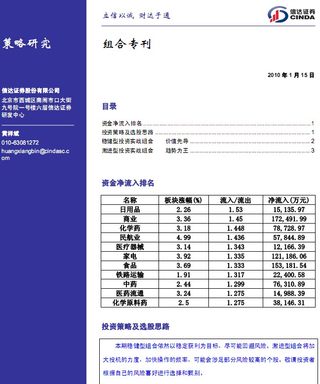 本期穩健型組合依然以穩定獲利為目標,盡可能回避風險。激進型組合將加大投機的力度,加快操作的頻率,可能會涉足部分風險較高的個股。敬請投資者根據自己的風險喜好進行選擇和甄別。 周四股指高開高走,幾乎以最高點收盤,準備金率上調帶來的負面影響短期內被消化,而三網合一帶來的投資機會將成為市場近期熱點。我們認為股指后市保持震蕩上漲格局概率較大,重點關注科技、消費、高送配板塊中的機會......