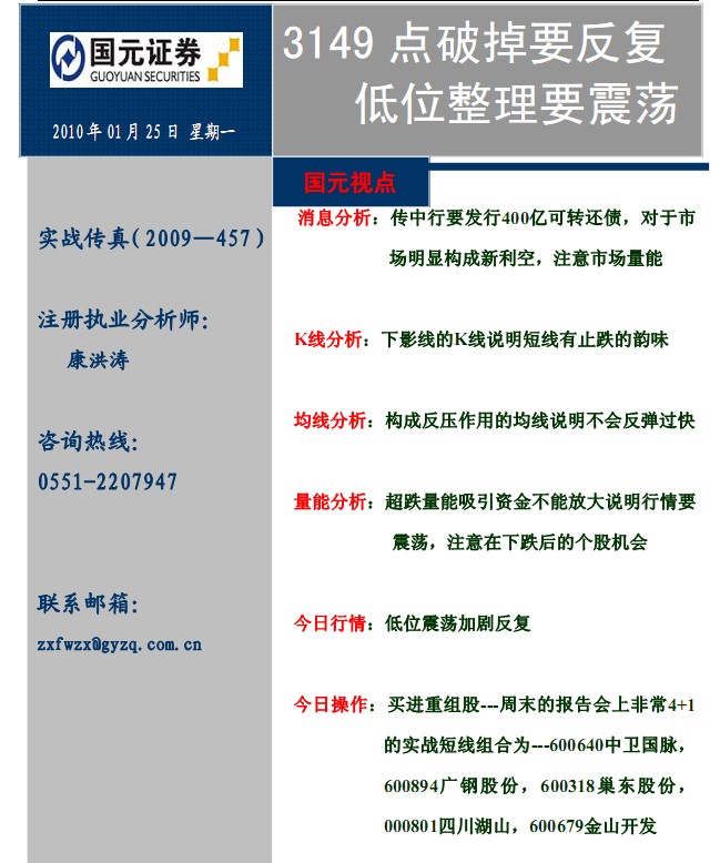 國元視點 消息分析:傳中行要發(fā)行400億可轉(zhuǎn)還債,對于市場明顯構(gòu)成新利空,注意市場量能 K線分析:下影線的K線說明短線有止跌的韻味 均線分析:構(gòu)成反壓作用的均線說明不會反彈過快 量能分析:超跌量能吸引資金不能放大說明行情要震蕩,注意在下跌后的個股機會 今日行情:低位震蕩加劇反復 ......