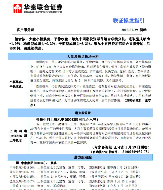 盤面特征;周五深滬市場小幅震蕩,平穩收盤。今日深滬市場略有低開,隨后震蕩向上,滬指在 3000 點上方似有企穩的跡象,然而尾盤在保險、銀行、房地產等板塊下滑的影響下,最終還是在 3000 點下方以微跌收盤,滬市微漲。板塊方面,建材、醫藥、農林牧漁、商業連鎖等板塊表現較好,而保險、鐵路基建、煤炭石油、稀缺資源、黃金、有色等板塊表現較為疲軟。兩市漲跌比約為 5:3,10 只個股漲停,無個股跌停。 后市研判:今日仍然延續昨天中小盤股活躍,權重股相對較為疲軟的局面,滬深指數漲跌不一也反應出該現象。建材板塊在建材下鄉消息的刺激下,今日領漲大盤,農業板塊繼續上漲,而商業連鎖等板塊也趁著假期的臨近有所表現。然而大盤反彈乏力,雖然有新股暫停發行的所謂利好,對市場并未構成太大刺激,后市仍需警惕.......