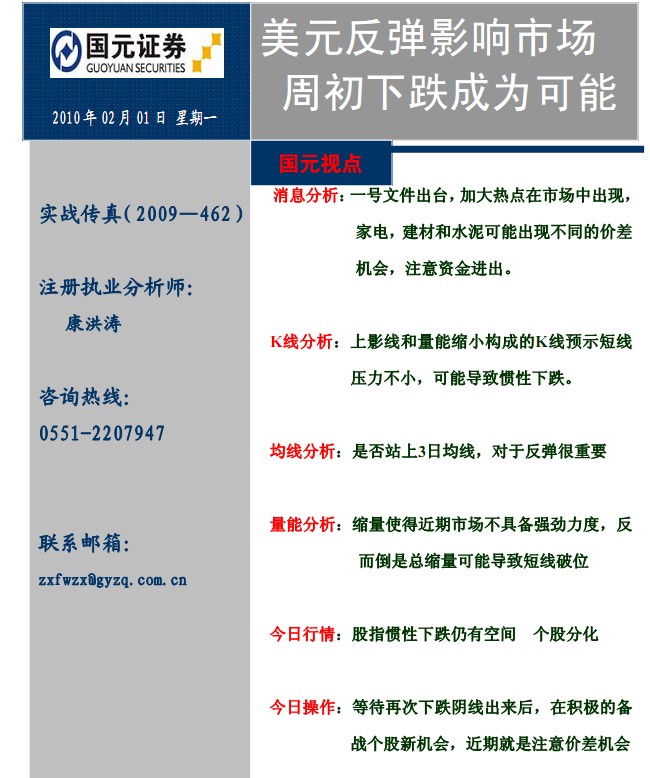 國元視點:消息分析: 一號文件出臺, 加大熱點在市場中出現,家電,建材和水泥可能出現不同的價差機會,注意資金進出。 K線分析:上影線和量能縮小構成的K線預示短線壓力不小,可能導致慣性下跌。 均線分析:是否站上3日均線,對于反彈很重要 量能分析:縮量使得近期市場不具備強勁力度,反而倒是總縮量可能導致短線破位 今日行情:股指慣性下跌仍有空間 個股分化 今日操作:等待再次下跌陰線出來后,在積極的備戰個股新機會,近期就是注意價差機會.......