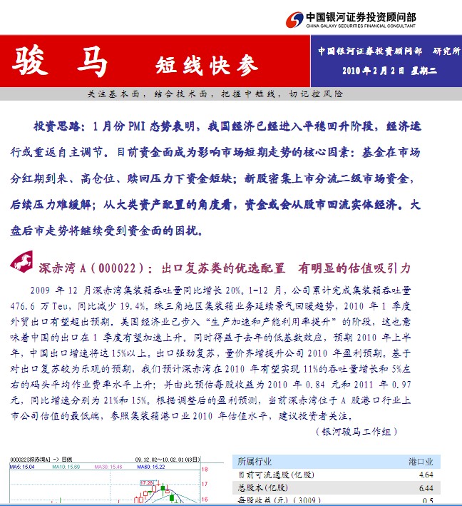 深赤灣 A ( 000022 ): 出口復(fù)蘇類的優(yōu)選配置 有明顯的估值吸引力 2009 年 12 月深赤灣集裝箱吞吐量同比增長 20% 。 1-12 月 , 公司累計完成集裝箱吞吐 量 476.6 萬 Teu , 同比減少 19.4% 。 珠三角地區(qū)集裝箱業(yè)務(wù)延續(xù)景氣回暖趨勢 , 2010 年 1 季度外貿(mào)出口有望超出預(yù)期。美國經(jīng)濟(jì)業(yè)已步入 “ 生產(chǎn)加速和產(chǎn)能利用率提升 ” 的階段,這也意味著中國的出口在 1 季度有望加速上升。同時得益于去年的低基數(shù)效應(yīng),預(yù)期 2010 年上半年 , 中國出口增速將達(dá) 15% 以上 。 出口強(qiáng)勁復(fù)蘇 , 量價齊增提升公司 2010 年盈利預(yù)期 。 基于......