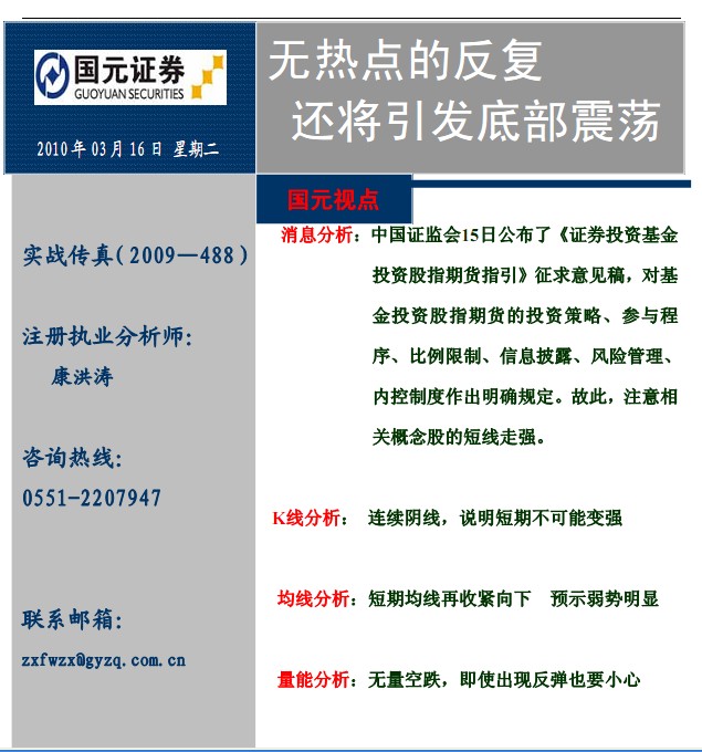 消息分析:中國證監會15日公布了《證券投資基投資股指期貨指引》征求意見稿,對金投資股指期貨的投資策略、參與序、比例限制、信息披露、風險管理內控制度作出明確規定。故此,注意關概念股的短線走強。 K線分析: 連續陰線,說明短期不可能變強 均線分析:短期均線再收緊向下 預示弱勢明顯 量能分析:無量空跌,即使出現反彈也要小心 今日行情:再次面臨考驗2950點有效支撐作用 .......