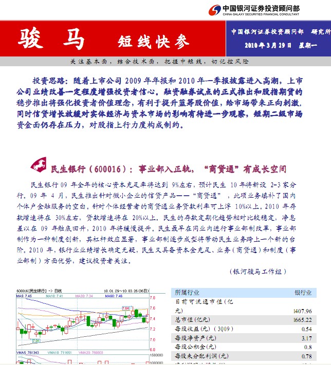 民生銀行( 600016 ):事業部入正軌, ):“ 商貸通 ” 有成長空間 民生銀行 09 年全年的核心資本充足率將達到 9% 左右 , 預計民生 10 年將新設 2-3 家分行 。 09 年 4 月 , 民生推出針對微小企業的信貸產品 —— “ 商貸通 ” , 此項業務填補了國內個體戶金融服務的空白 。 針對個體經營者的商貸通業務貸款利率可上浮 10% 以上 。 2010 年存款增速將在 30% 左右,貸款增速將在 20% 以上。民生的存款定期化趨勢相對比較穩定,凈息差以在 09 年觸底回升 , 2010 年將緩慢提升 。 民生最早在同業內進行事業部制改革 , 事業部制作為一種制度創新,其杠桿效應顯著,事業部制逐步成型將帶動民生業務跨上一個新的臺........