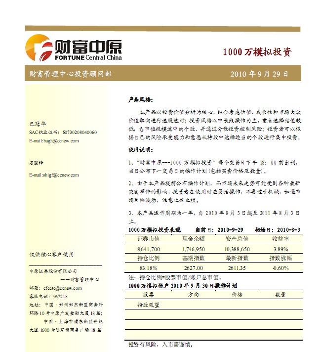 9月30日中原證券1000萬模擬盤