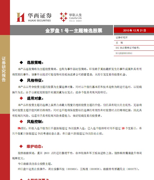 12月21日華西證券金羅盤1號