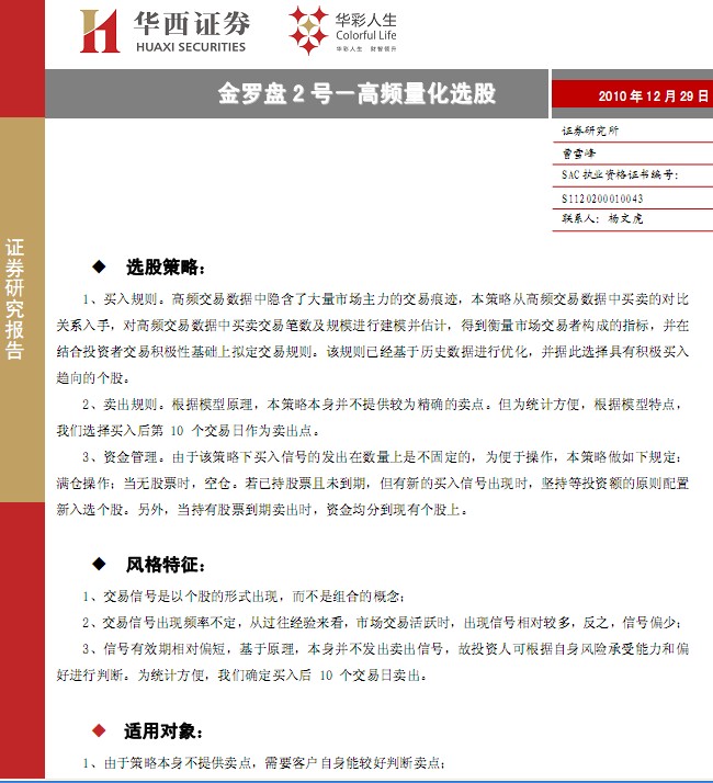 12月29日華西證券金羅盤2號