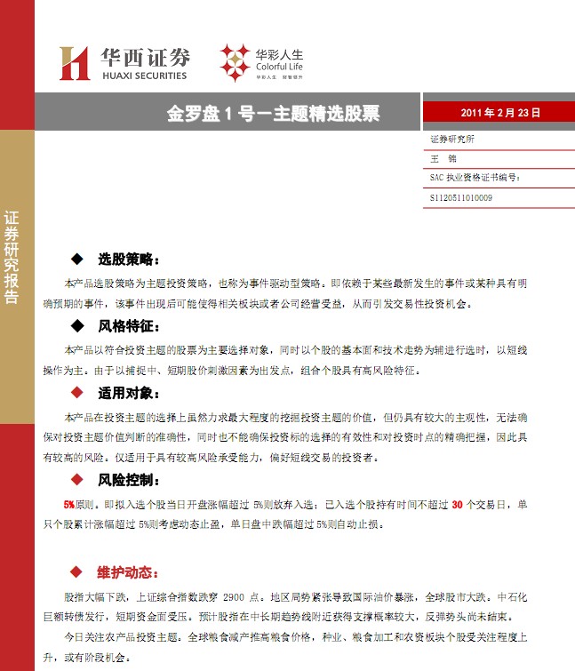 2月23日華西證券金羅盤1號