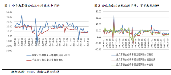 宏觀經濟正處于緩慢企穩回升階段是目前市場的普遍觀點,我們認為在2013年宏觀經濟企穩回升后,零售板塊有望跟隨經濟緩慢復蘇,復蘇的程度和力度還需要看總體經濟增速水平,價格指數對復蘇的程度存在影響,但影響程度小于總體經濟環境的影響。我們預計明年社零增速提升是大概率事件,預計全年社零增速在14.4%左右。基于低基數效應,板塊收入增速提高概率大。