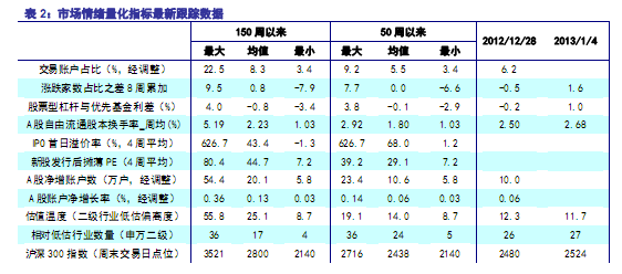2013 年第一周(2012 年12 月31 日至2013 年1 月4 日)僅兩個交易日,大盤延續上周反彈態勢,量價繼續放大,中小盤走勢偏弱。上證綜指本周反彈1.96%至2276.99 點,滬深300 指數上漲1.79%,中小板指數下跌0.44%,創業板指數下跌0.33%,年報高送轉炒作弱化。從經濟面上看,新型城鎮化、城市智能化、金融改革等利好政策得以確定,市場對經濟增長預期較為樂觀,以QFII、RQFII 為代表的海外資金加速流入亦構成了股指反彈的重要推動力量;相對而言,大非延后減持壓力的釋放,IPO 排隊公司持續增加,且市場對新三板擴容預期強化則加大了中小盤股的供給壓力,伴隨著春節的臨近,現金需求大幅上升,資金面或趨緊,這對股市反彈亦是一個考驗。