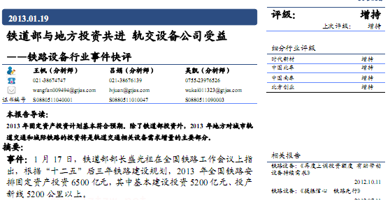 鐵路設備行業研究報告:國泰君安-鐵路設備行業事件快評:鐵道部與地方投資共進,軌交設備公司受益