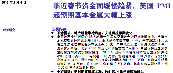 研究報告:申銀萬國-中觀觀察2013年第4期:臨近春節資金面緩慢趨緊,美國PMI超預期基本金屬大幅上漲