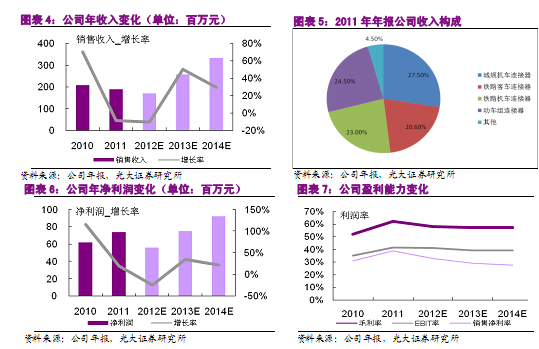 軌道交運設備連接器龍頭 行業增長和進口替代是兩大驅動力 公司是我國主要的鐵路軌交車輛連接器供應商,是動車CRH2 型216 芯連接器唯一國產供應商。公司在地鐵連接器領域市占率超過30%,在軌道交通連接器領域市占率達19%,雙雙居國內第一。我們預計軌道交通連接器行業增速將超過20%,未來公司的高增長將主要來自于行業的增長和市場占有率的進一步提升。這其中有兩個契機:一是競爭對手實力遭到削弱,二是動車組連接器國產化進程加速。 目前我國38%以上的軌道交通連接器仍從國外企業采購,其中動車組連接器外企占比高達65.9%。由于軌道交通連接器技術壁壘高,認證至少需要2-3 年,行業競爭格局較為穩定。在國家對動車組技術逐步實現國產化率70%目標下,國內企業技術積累較快,成本和服務優勢顯著,進口替代路徑明確,未來有望充分受益。另外,公司還逐步向新能源(電動汽車和風電)、軍工和通訊連接器等新興領域延伸。