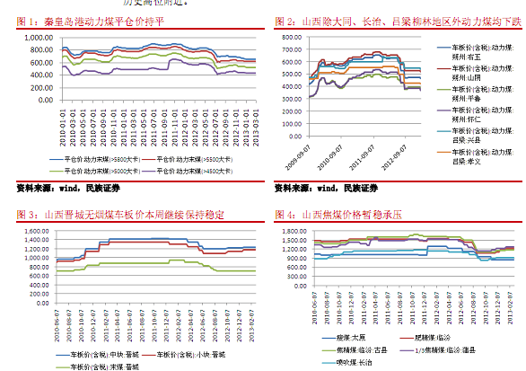 ● 秦港動力煤價暫企穩(wěn),山西動力煤價格下跌。本周秦港動力煤價格與上周持平。3 月1 日山西朔州、臨汾、晉中、忻州、陽泉地區(qū)動力煤車板價下跌5-15 元/噸,淮南5500 大卡動力煤車板含稅價本周下跌5 元至610 元/噸。12 年12 月初以來中轉(zhuǎn)港口動力煤價跌壓力已經(jīng)傳導(dǎo)至上游產(chǎn)地。