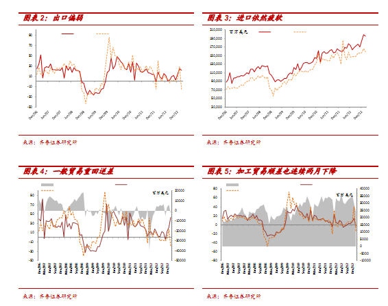 2013 年2 份出口同比增長(zhǎng)21.8%,季節(jié)調(diào)整后出口環(huán)比下降1.8%(X12,非年化率,下同)。一般貿(mào)易出口同比增長(zhǎng)43.3%,環(huán)比下降5.1%;加工貿(mào)易出口同比下降3.4%,環(huán)比下降9.4%。